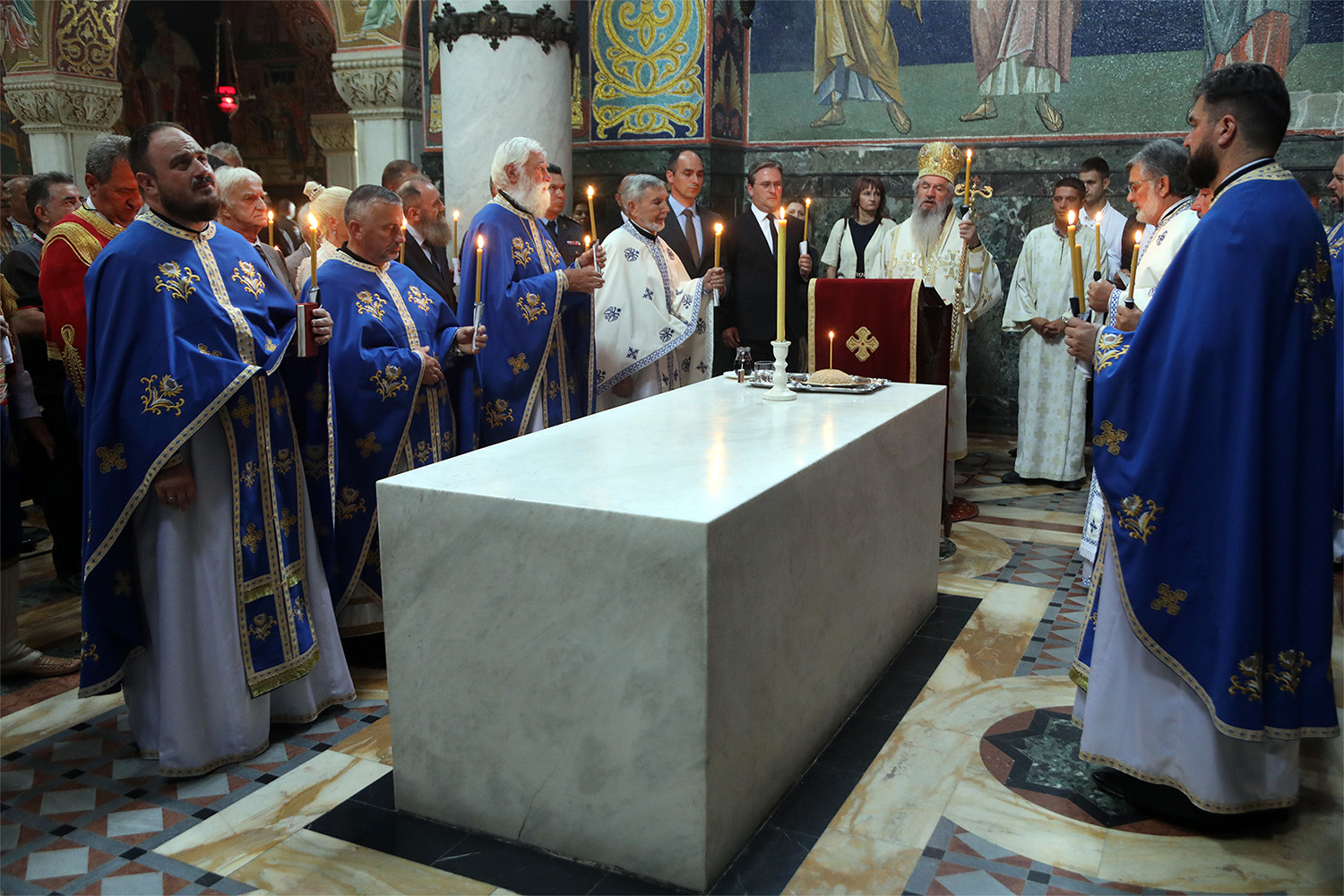 Holy Liturgy and memorial service were officiated by His Grace Bishop Jovan of Sumadija. After the church service, as part of the ceremony of paying respect to the beloved King, wreaths were laid on his tomb by: Mr. Predrag Markovic, on behalf of HRH Crown Prince Alexander, who due to previously arranged obligations abroad was not able to personally attend, TRH Prince Mihailo and Princess Ljubica, HE Mr. Nikola Selakovic, Minister for Labour, Employment, Veterans and Social Affairs representatives of the Army of Serbia, Municipality of Topola, Kingdom of Serbia Association, which is under Crown Prince’s patronage, representatives of Foundation of King Peter I in Oplenac, and people who gathered to pay their respects to “Uncle Pete”, as people, out of love, called King Peter I.