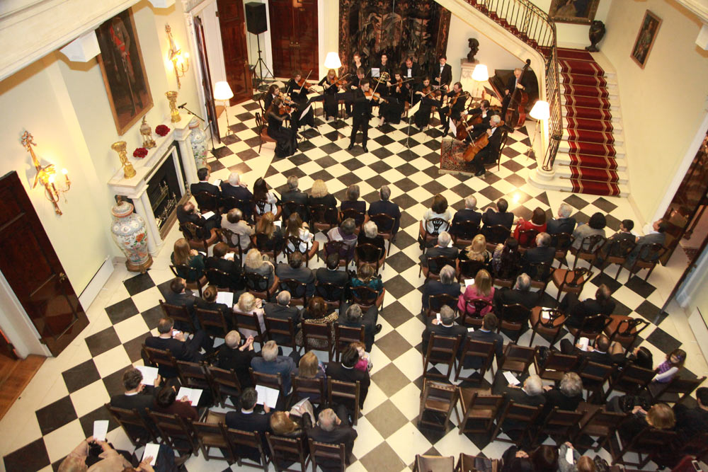 Њихова Краљевска Височанства Престолонаследник Александар II и Принцеза Катарина били су вечерас у Белом Двору домаћини концерта Краљевских гудача Светог Ђорђа, који раде под покровитељством Његовог Краљевског Височанства Принца Филипа, са Станком Мандићем на виолини, стипендистом фондације Њ.К.В. Престолонаследника Александра за таленте.