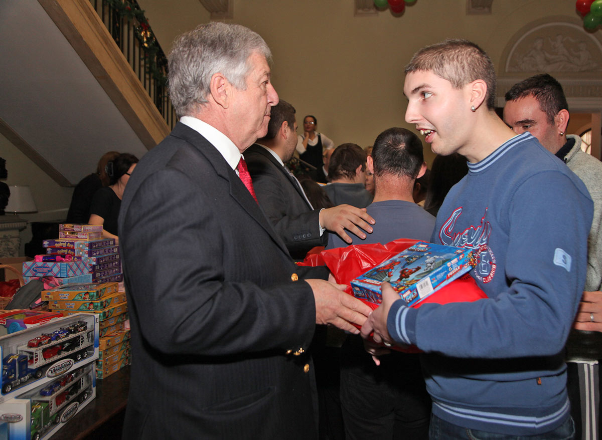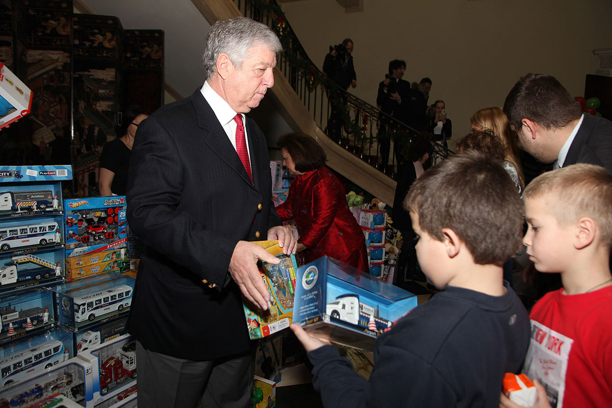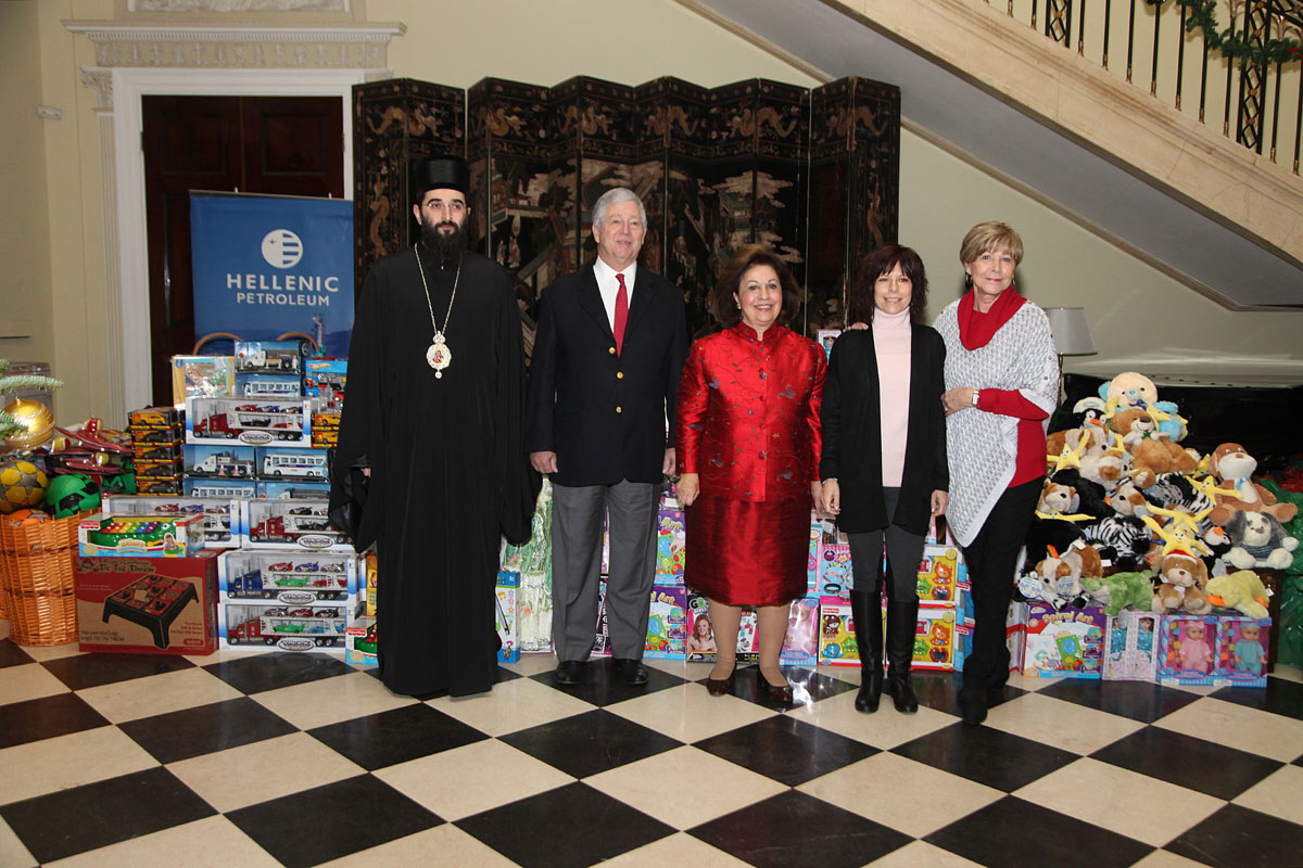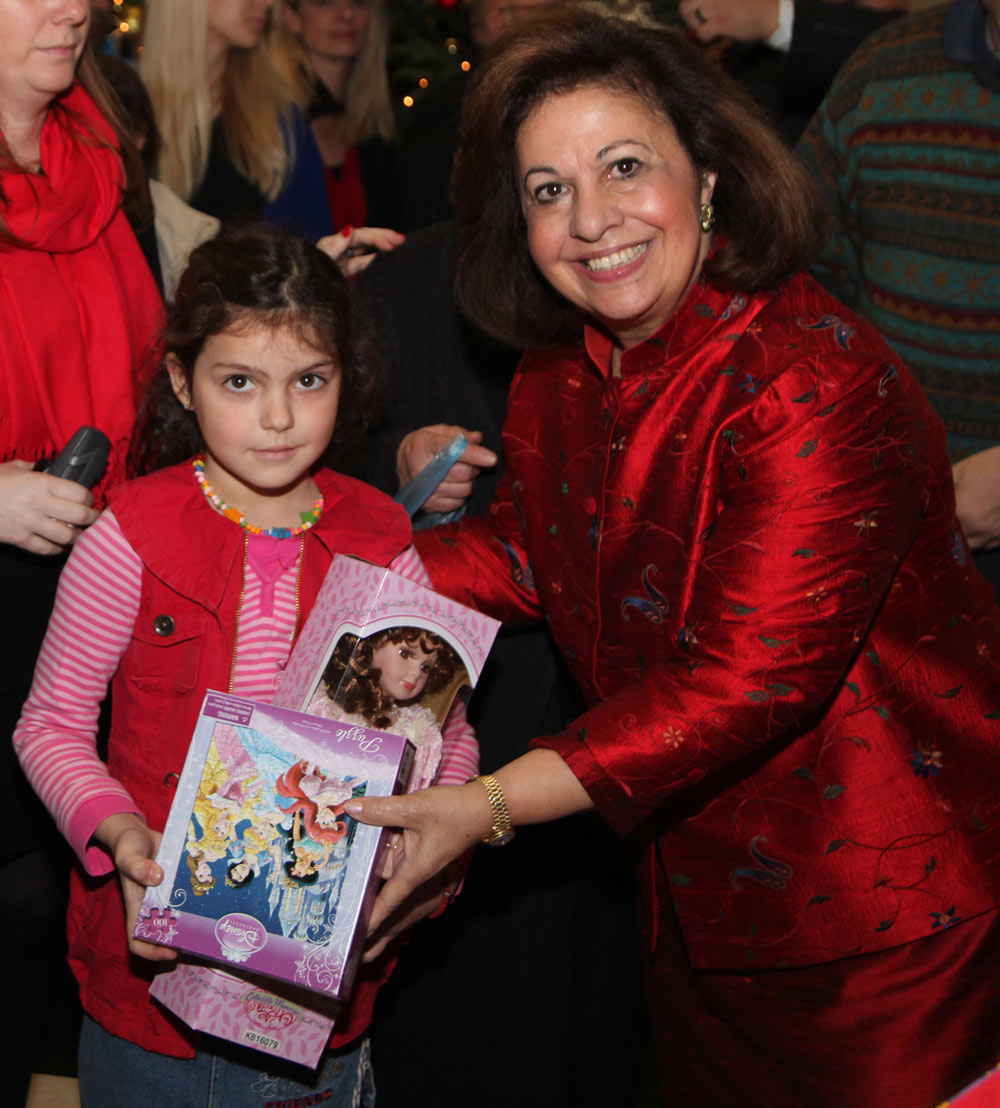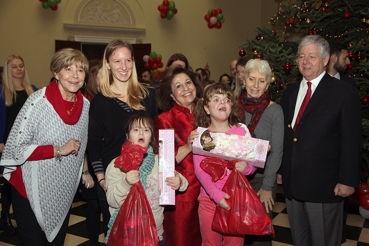 Predstavnici diplomatskog kora ambasade UAE, ambasade Japana, ambasade Ukrajine i ambasade Palestine, kao i g-đa Keti Fenslou, predsednica Lajflajn Čikago humanitarne organizacije, čijom velikodušnošću su prikupljene igračke za decu, i njena ćerka Trejsi Armstrong, pomagali su Njihovim Kraljevskim Visočanstvima prilikom podele poklona deci.